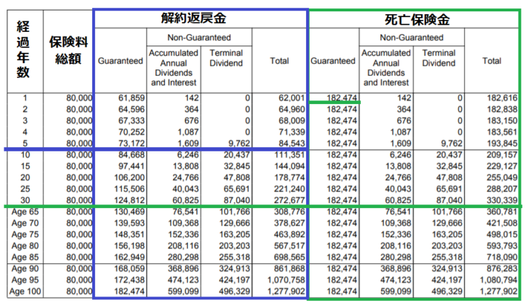 緑枠死亡保険金の推移を見ていくと、経過年数1年後、保険料USD80,000に対して確約で約USD182,000保証されています。この死亡保険金も、複利の効果で年々増えていき、30年後の62歳で万一死亡した場合には約USD330,000家族に支払われるカタチとなります。
