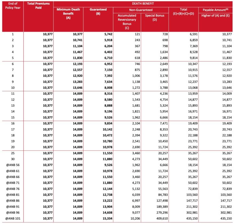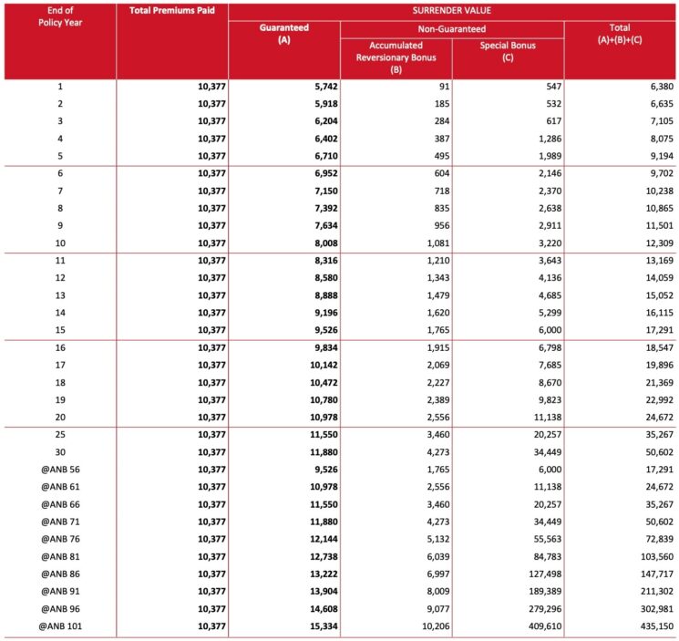 ・20年後:解約返戻金合計USD24,672(確定部分:USD10,377)