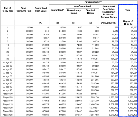 ・30年後:解約返戻金合計USD161,054(確定部分:USD38,400)
