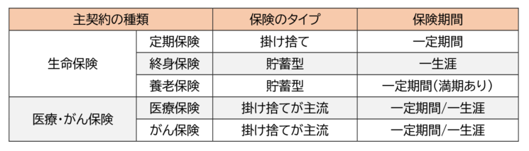 生命保険のベースとなる主契約にはさまざまな種類があります。どういったときに保険金ができるか、保険期間は一定期間なのか一生涯なのかなどによって以下のような種類があります。