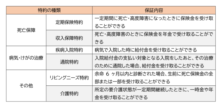 一定期間の死亡保障を厚くするもの、病気や怪我の治療に備えるもの、要介護状態になったときに備えるものなど、主契約の保障内容を充実させることができます。他にさまざまな特約がありますが、以下主な種類を挙げました。