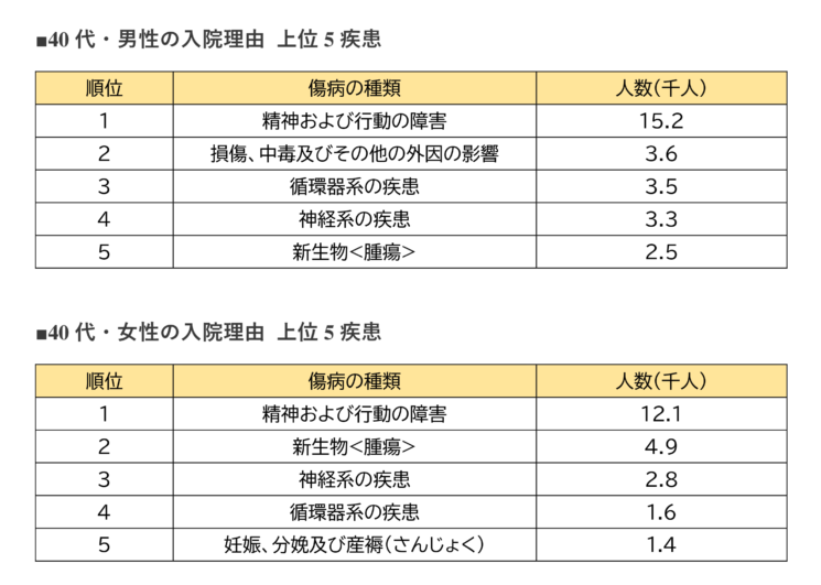 それでは40代の人がどのような理由で入院をしているのか、厚生労働省のデータから実際の数値を見てみましょう。