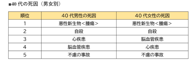 40代の死因の1位は「がん」です。そのほかにも心疾患や脳血管疾患など生活習慣病による死亡も増えてきます。日頃から規則正しい生活を心がけ生活習慣病にならないように健康に気を配りましょう。