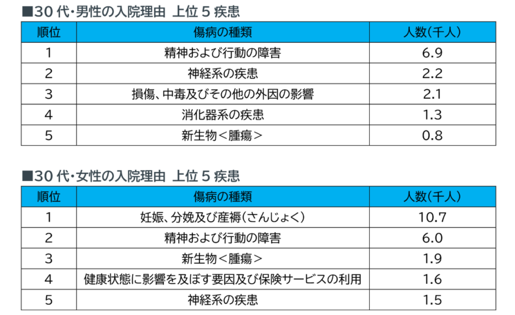 30代の女性は、1位が「妊娠,分娩及び産褥」による入院です。2位の「精神及び行動の障害」については20代に比べると人数が2倍以上に増えています。そして3位には「新生物<腫瘍>」とありますがこれは「がん」のことです。