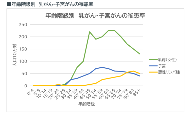がん罹患率は年齢と共にアップしていくのが一般的ですが、下図のように女性特有のがんの場合は30代から、とくに「乳がん」において30代で罹患率が急上昇しています。