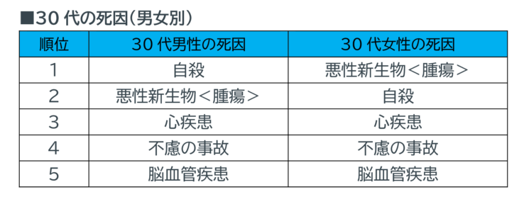 30代の男女別の死因について5位までを見てみると、「自殺」と「がん」による死因が上位にきています。男性は「心疾患」 、女性は「女性特有のがん」のリスクが高くなってくる年代です。