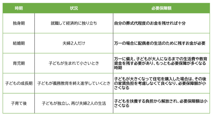 生命保険の加入においては、ライフステージの変化にあわせて必要保障額や加入すべき保険を選ぶことが重要になります。