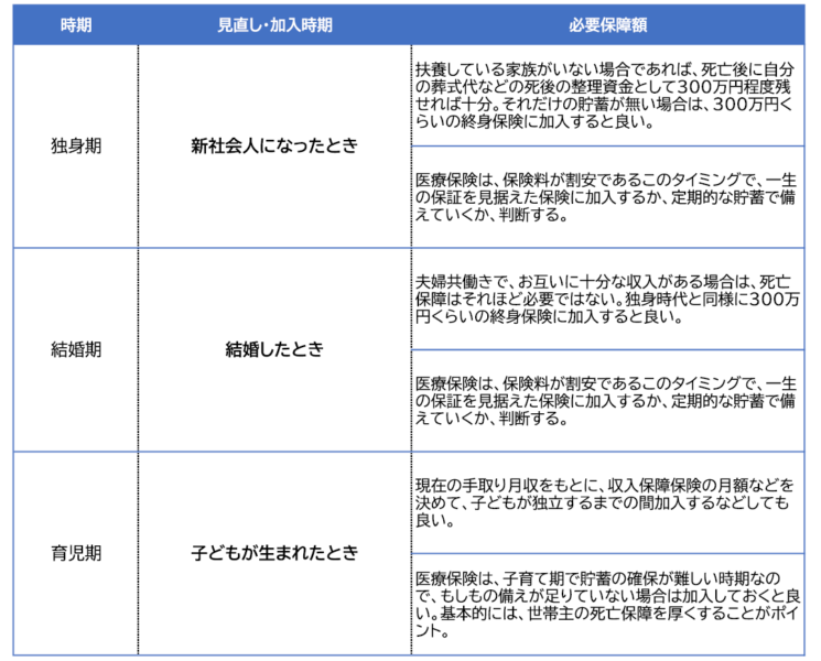 生命保険の加入においては、ライフステージの変化にあわせて必要保障額や加入すべき保険を選ぶことが重要になります。