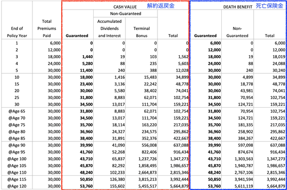 ・30年後:解約返戻金合計USD159,221(確定部分:USD34,500)