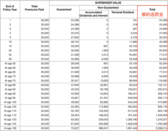 ・30年後:解約返戻金合計USD94,830(確定部分:USD32,999)