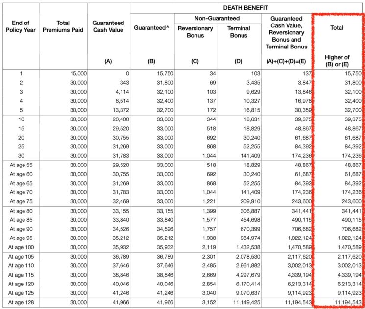 ・30年後:解約返戻金合計USD174,236(確定部分:USD31,783)