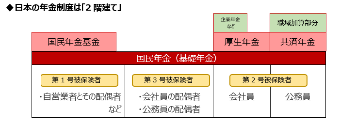 現段階での、日本の公的年金制度は、日本に住む20歳以上60歳未満が全員加入する「国民年金」と、会社員が加入する「厚生年金」・公務員が加入する「共済年金」の2階建てになっています。