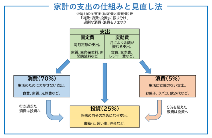 まずは月々の支出項目を「消費」「浪費」「投資」の3つに分けてみましょう。まるで支出のポートフォリオですね。