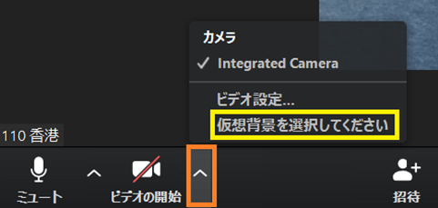〔ビデオの開始〕横にあるオレンジ枠内をクリックし、黄色枠内 〔仮想背景を選択〕を選択してください。